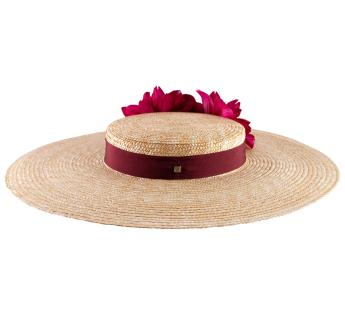Este sombrero de paja es muy estival sobre todo con su composición floral de los colores ardientes y brillantes. Su forma híbrida entre el canotié y la capelina cubrirá muy bien la cabeza con aun sombra para las espaldas.