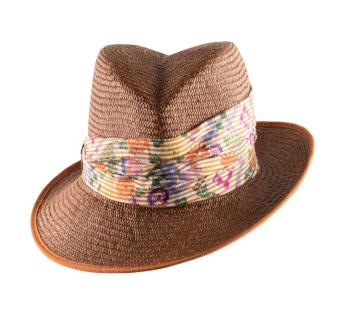 Sombrero panama auténtico de Cuenca, en Ecuador. Su materia natural es adornada con un lino colorido del motivo florecido. Su copa dividida es más bien alta mientras su ala asimétrica añade un toque original. Cubrirá con estilo nuestros vestidos aportando un toque relajado original.