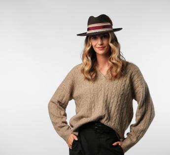 El romanticismo y el espíritu bohemio se unen en este Fedora fabricado en nuestro taller de Lyon. Un sutil juego de texturas y materiales: trenza de grosgrain, encaje, cinta deshilachada... Cada elemento enriquece la silueta sin sobrecargarla. El motivo floral estampado en el ala aporta un toque poético, casi vintage.