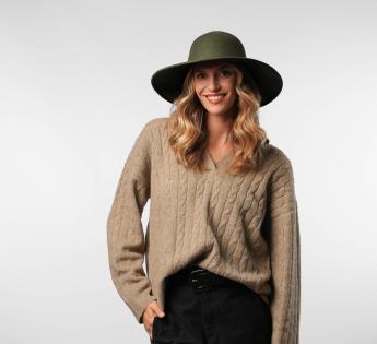 Pureza y elegancia para esta Pamela de lana afieltrada, de diseño minimalista y sin adornos. Su copa redonda y sus amplios bordes crean una silueta fluida, llena de gracia. Fabricada en Italia, ofrece una buena estructura sin dejar de ser flexible y agradable de llevar.