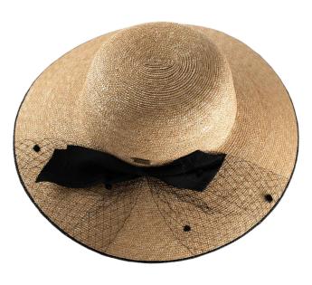 Este sombrero posee todo el encanto de las siluetas femeninas. Su línea holgada, su paja finamente trenzada, su lazo anudado y su velo ligero componen un aire chic, delicadamente vintage, lleno de gracia y carácter.