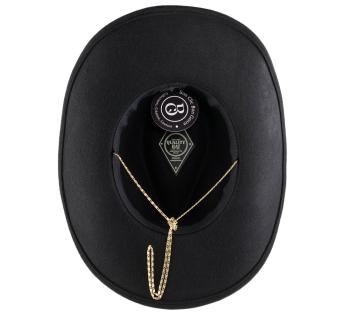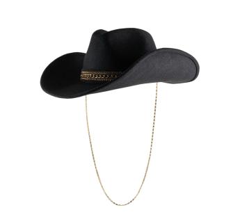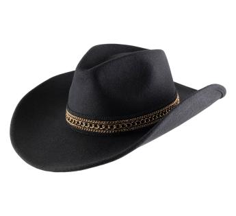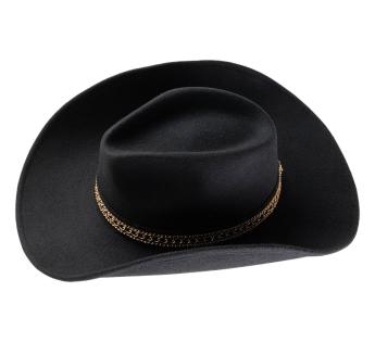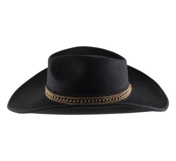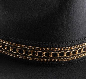 Confeccionado en fieltro de lana, es a la vez cálido, impermeable y duradero. La trenza adornada con cadenitas doradas añade un toque luminoso y contrastante, entre clasicismo y audacia. El fino darbiquejo estilo cadenita subraya su carácter y permite un uso más seguro.