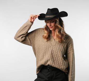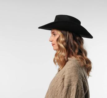 Este sombrero western se impone por la libertad que ofrece a su portador. Su amplia ala, completamente bordeada de latón, puede moldearse a voluntad: levantada para un espíritu cowboy audaz, ligeramente curvada para un estilo más discreto, o dejada recta para una apariencia contemporánea. Un verdadero terreno de juego estilístico.