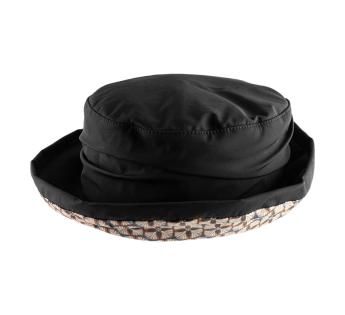 Elegante y moderno sombrero bob confeccionado con tejido de tafetán impermeable recubierto. La parte inferior del ala es de color, con formas geométricas, y juega maravillosamente con los contrastes.