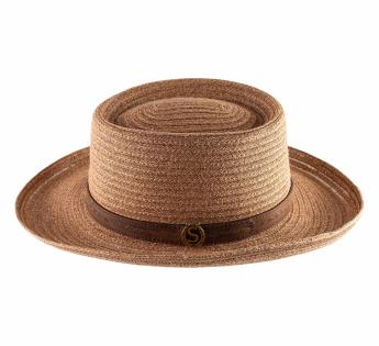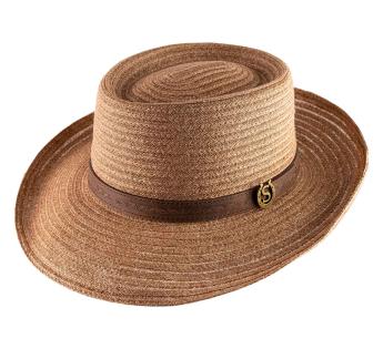 Sombrero en el estilo cordobés con un ala modulable. Ha sido confeccionado con paja cosida. Está decorado por una cinta de cuero, para añadir un toque rústico al conjunto.