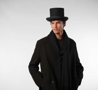 Este sombrero de copa en fieltro de lana endurecido encarna la elegancia en su forma más pura. Su copa alta, deliberadamente acentuada, crea una línea vertical majestuosa, característico de las grandes siluetas de gala. El fieltro rígido, trabajado con precisión, asegura una sujeción impecable y un acabado refinado.