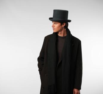 Este sombrero de copa en fieltro de lana endurecido encarna la elegancia en su forma más pura. Su copa alta, deliberadamente acentuada, crea una línea vertical majestuosa, característico de las grandes siluetas de gala. El fieltro rígido, trabajado con precisión, asegura una sujeción impecable y un acabado refinado.