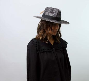 Sombrero de fieltro de conejo con un cepillado mélusine para crear ese efecto crudo a su vestido. Este último es personalizado por medio de un motivo leopardo, lo que añade un toque refinado a la creación. En cuanto a su copa dividida, es rodeada con una banda decorativa de satén acabada por un nudo y una pluma contrastado.