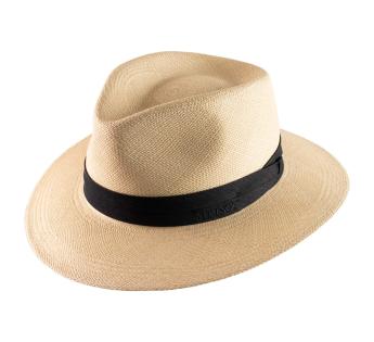 Sombrero panamá Montecristi adornado con cinturón de cuero negro, sobrio y elegante. Muy ligero, muy aislante, está realizado mediante un trenzado manual ultrafino.