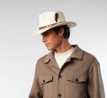 Con sus bordes laterales ligeramente levantados y su silueta afirmada, este sombrero revisita el estilo vaquero con un toque contemporáneo. La copa, esculpida con líneas suaves, se complementa con una trenza de cuero adornada con bordados y una pluma natural desmontable.