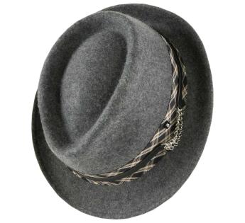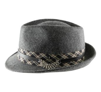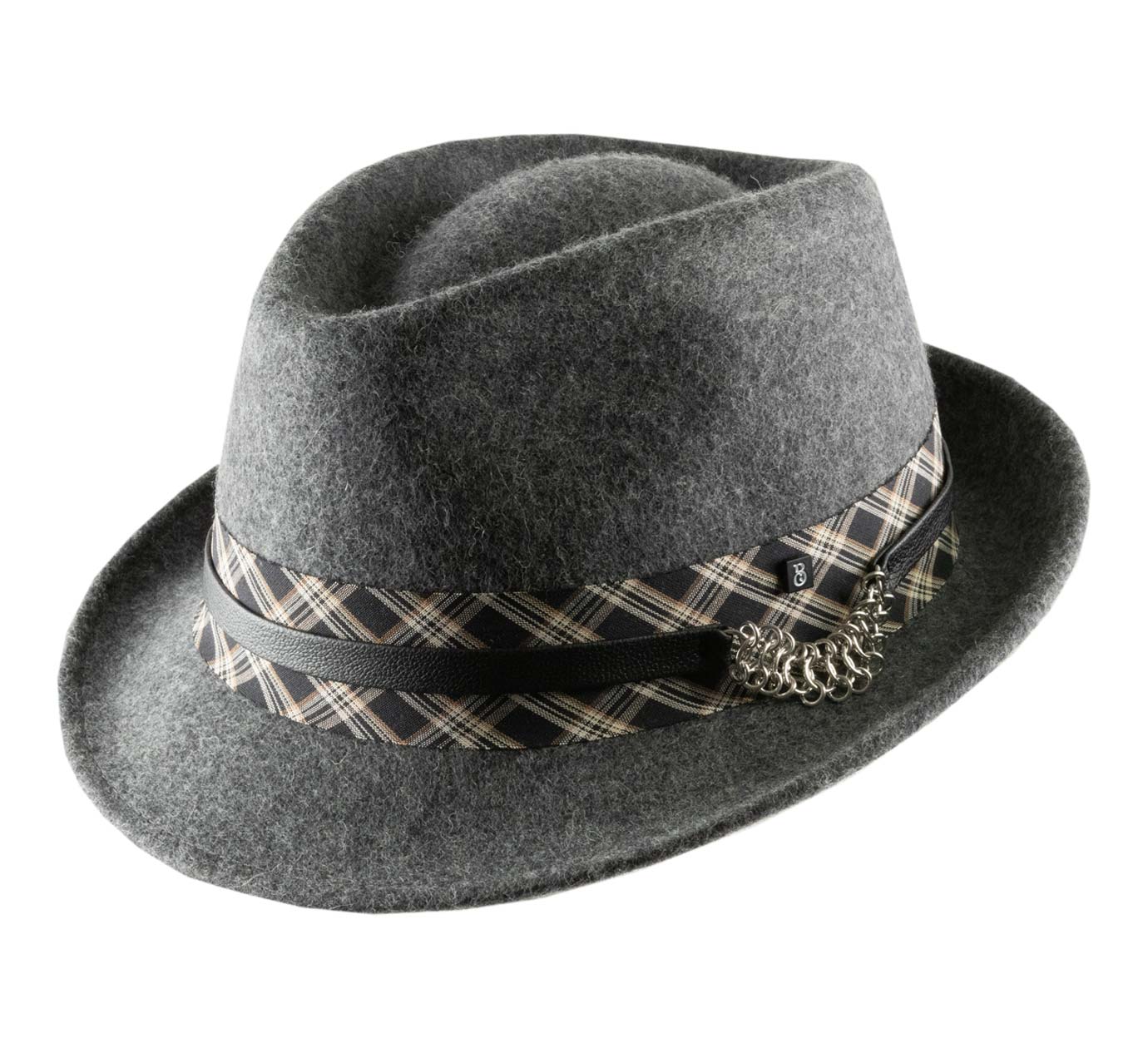Intrínsecamente elegante y deportivo, el modelo Trilby es el sombrero de todas las ocasiones. Fresco en estilo y de una cubertura cálida, esta versión de fieltro es embellecida por una cinta doble constituida de una banda de tela que lleva encima una fina correa de cuero atada por un conjunto de anillos de metal.