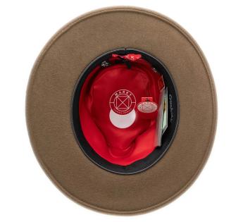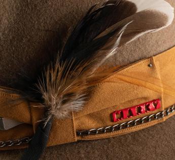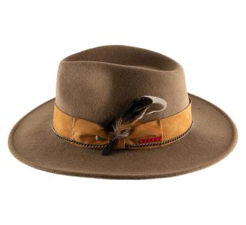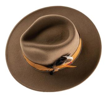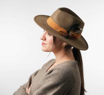 La asociación de materias es una de las tendencias está temporada. Compruébelo usted mismo con esta combinación fieltro/ante bien pensado. El resultado es un sombrero clásico relevado por una cinta del color natural alegre que muestra pespuntes, fantasía y una pluma. Aprovechamos así una creación a la cual ha sido añadido un bonito toque de brillo.