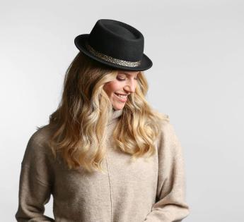 Este sombrero porkpie de fieltro de lana combina elegancia y audacia. Su copa está adornada con un detalle de estampado de leopardo, que añade un toque salvaje y refinado. La discreta insignia metálica completa el estilo con elegancia.