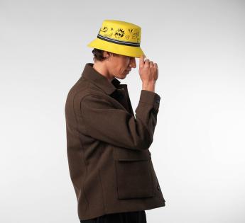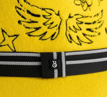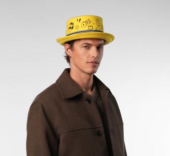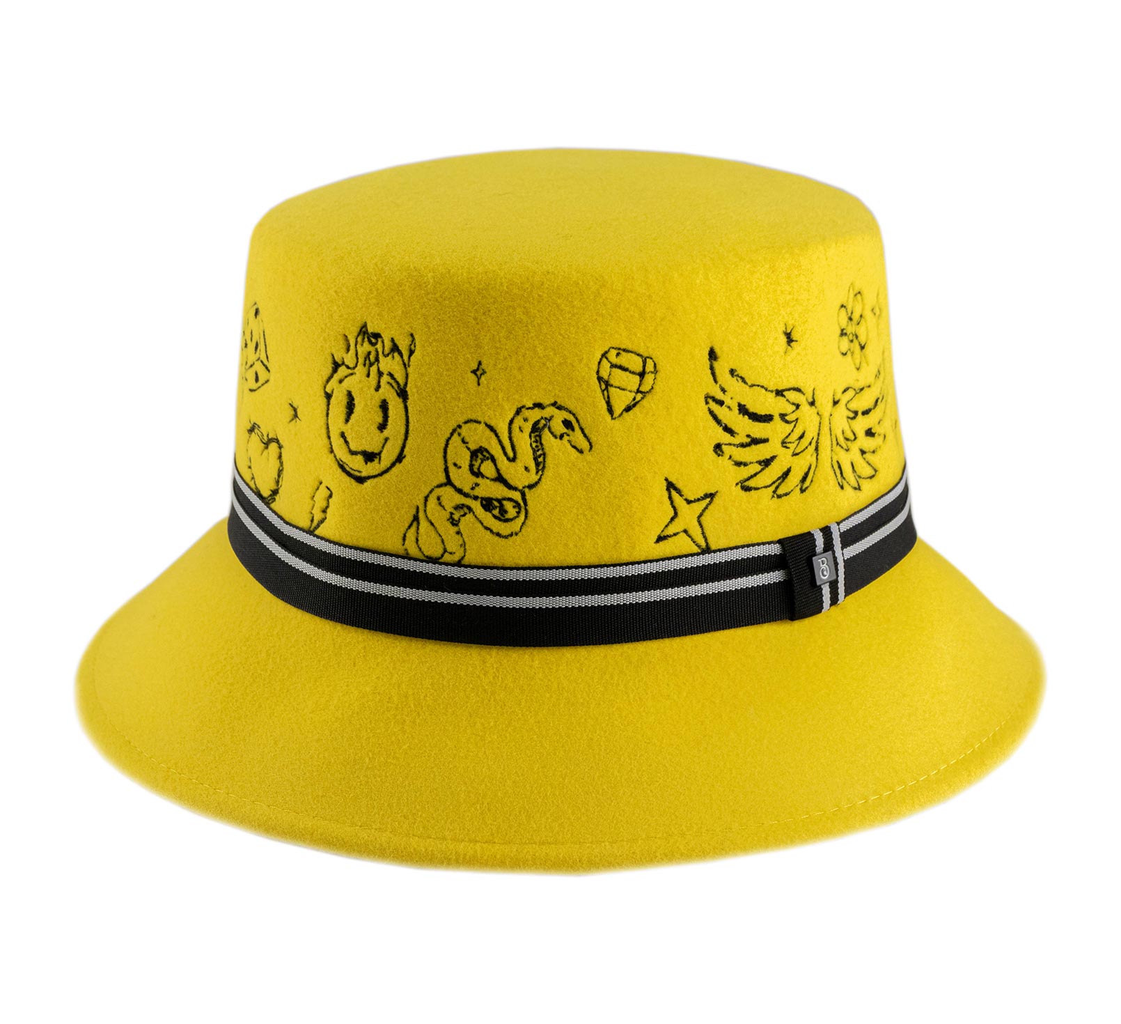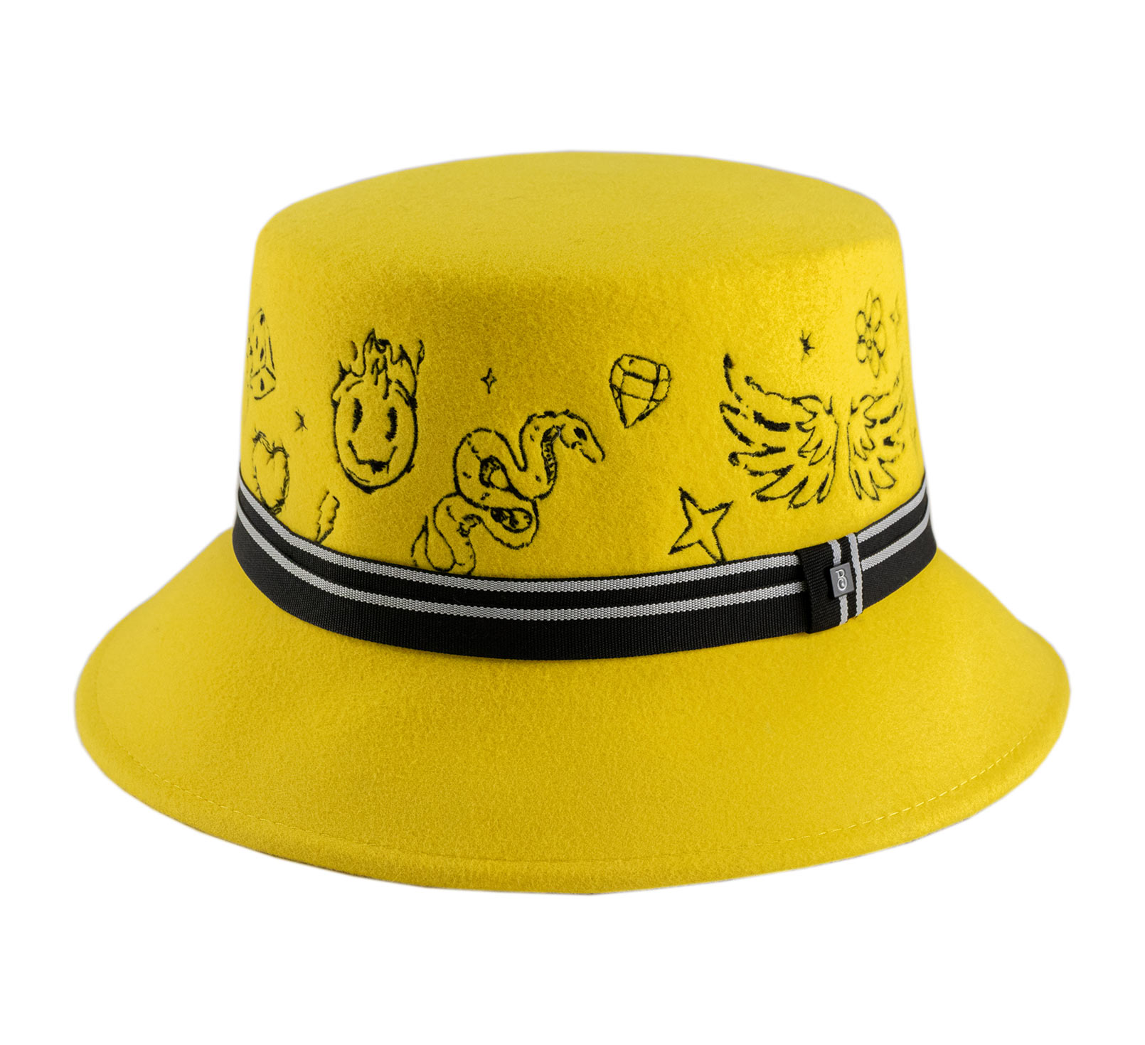 Colorido, audaz y ultra-creativo, este sombrero de cubo en fieltro de lana reinventa los códigos del sombrero. Su copa plana está completamente bordada con motivos gráficos al estilo tatuaje, para un toque urbano y desenfadado. La trenza rayada estructura el conjunto, realzada por una Etiqueta metálica en el centro. Este modelo atrae todas las miradas, afirmando una verdadera libertad de estilo.