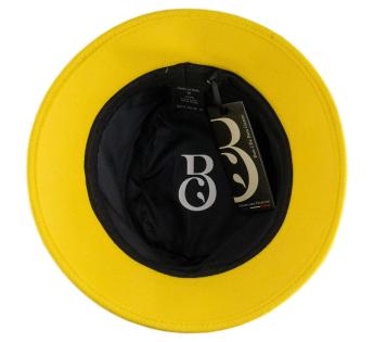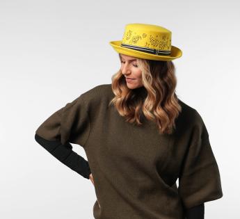 Disponible en tonos vibrantes, se puede llevar con ala recta o tesa alzato según el ánimo del día. A medio camino entre el look artístico y el espíritu urbano, combina tanto con un abrigo minimalista como con un atuendo más excéntrico. Un sombrero de cubo que desafía los estándares mientras conserva un verdadero saber hacer.