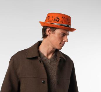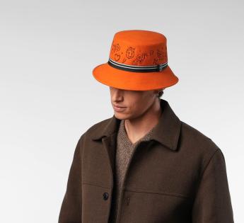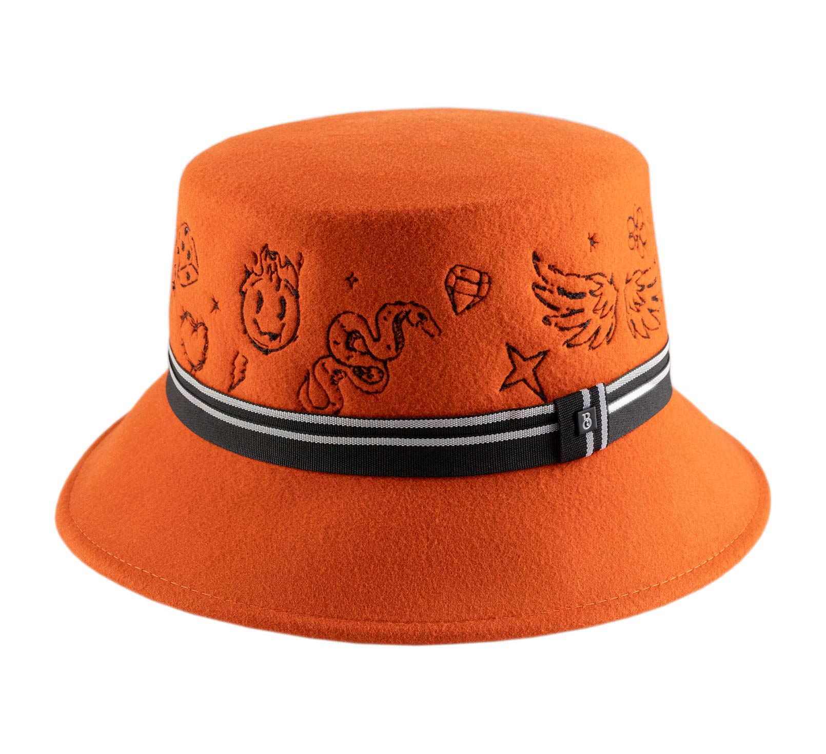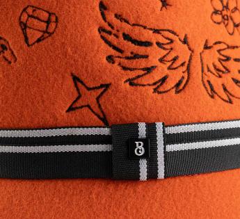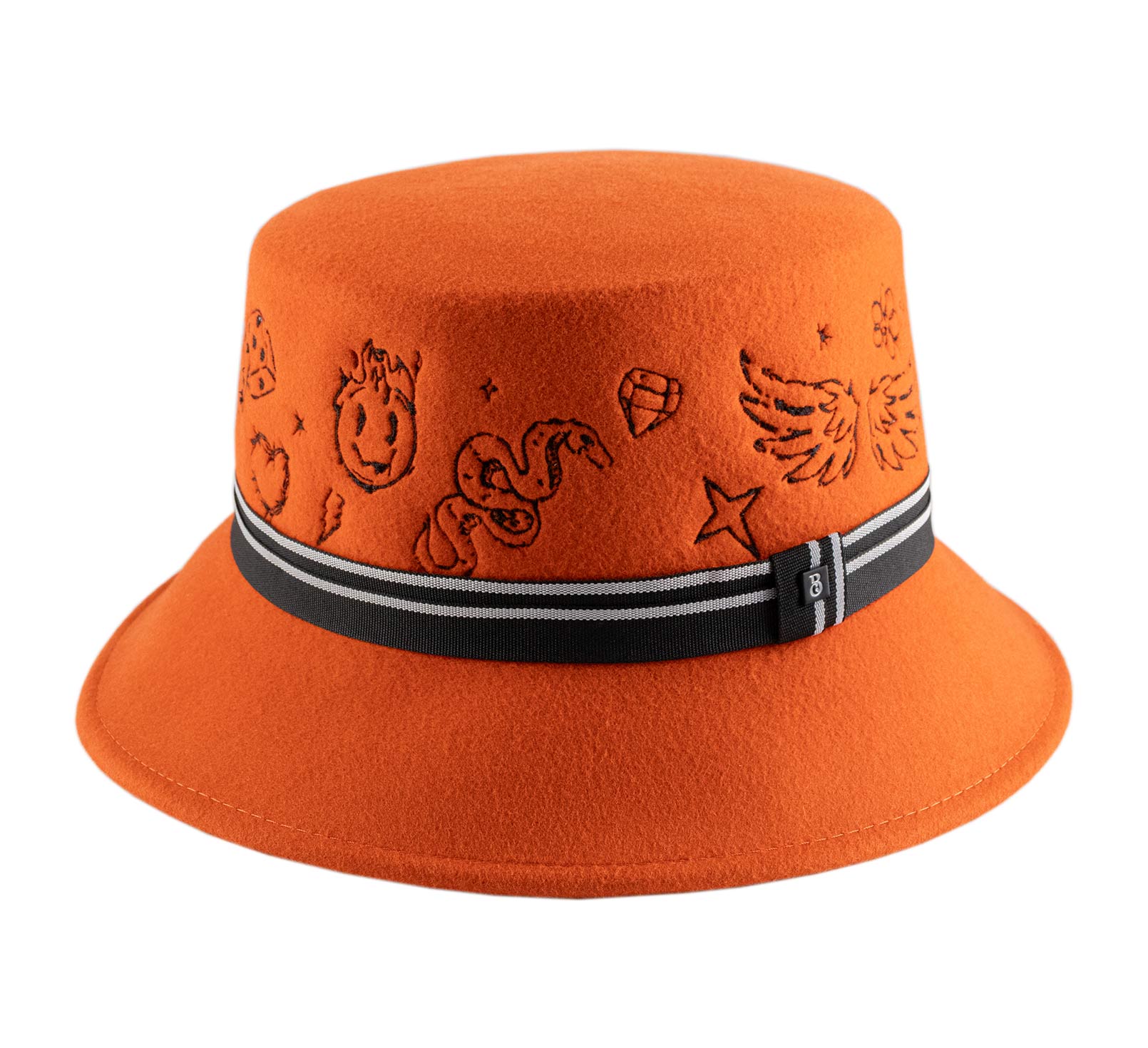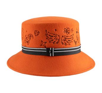 Colorido, audaz y ultra-creativo, este sombrero de cubo en fieltro de lana reinventa los códigos del sombrero. Su copa plana está completamente bordada con motivos gráficos al estilo tatuaje, para un toque urbano y desenfadado. La trenza rayada estructura el conjunto, realzada por una Etiqueta metálica en el centro. Este modelo atrae todas las miradas, afirmando una verdadera libertad de estilo.