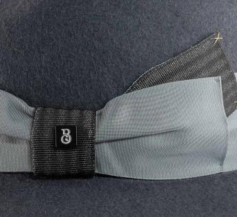 Fieltro de calidad moldeado en una forma de Fedora característica con sus dos huecos por ambos lados delante. Una banda de decoración de satén rayada grano grueso y tono sobre tono domina su ala nítida que cae ligeramente hacia los ojos. La creación es acabada por un detalle brillante de hilo dorado para aportar fantasía, en toda sutilidad. Ha sido realizada por la casa francesa B Couture cuyo logo aparece en la cinta.
