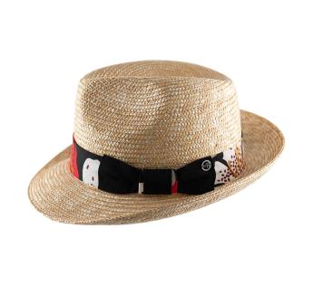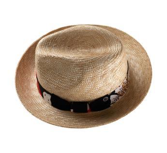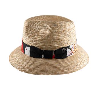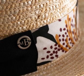 Un sombrero de múltiples facetas que baila con la luz estival. Su cinta de motivos vegetales juega con diseños abstractos, contrastados y llenos de color.
