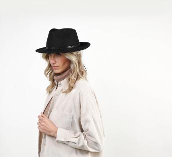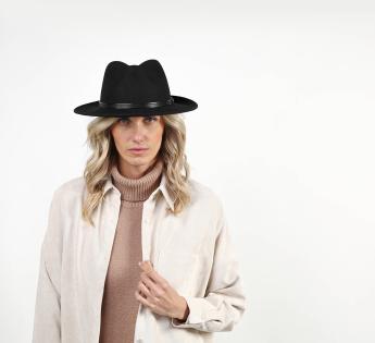 Traveller de versión chic y en un fieltro de alta calidad, naturalmente impermeable. Una forma legendaria adornada con un cuero personalizado por grabados a través motivos geométricos. El sombrero es de un diseño prolijo, perfecto como toque final.