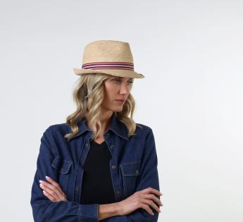 Sombrero de paja trenzado a mano de manera artesanal y que ofrece un look moderno. Es 100% compuesto de paja de palma rafia, cuyas fibras naturales de color claro han sido blanqueadas antes de ser sobrecoloridas. Con el fin de realzar el modelo, una decoración de rayas rojas viene rodear su copa en forma de gota de agua.