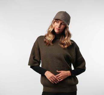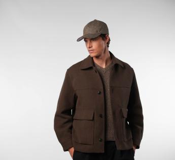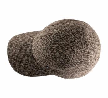 Su tejido de espiga con un tacto lanoso evoca la elegancia de los materiales tradicionales, mientras que su visera en polipiel aporta un juego sutil de materiales, cálido y refinado.