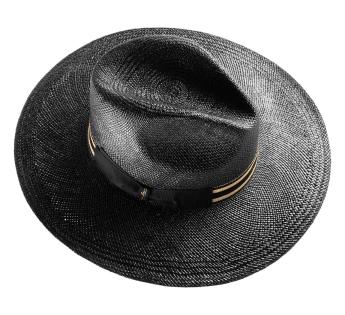 Panama Borsalino trenzado con una paja teñida negra. Su superficie es barnizada para un efecto muy reflectante. Expuesto a la luz, ofrece un refinamiento muy contrastado. Por otro lado, su tinto puede cambiar y aclararse después de una exposición prolongada al sol, rindiendo el modelo más único.
