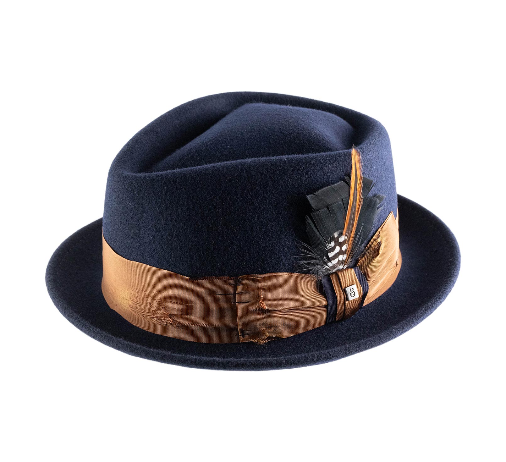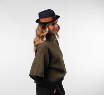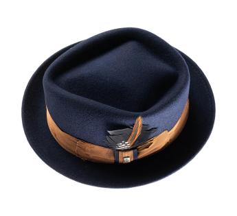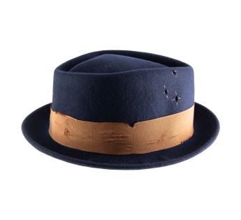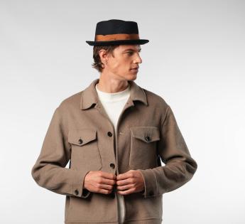 Este porkpie reinterpreta los códigos del clásico con un toque de audacia. Confeccionado en un fieltro de lana de bella densidad, revela un aspecto deliberadamente envejecido, casi cinematográfico.