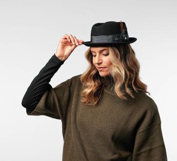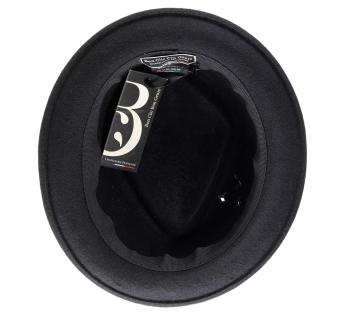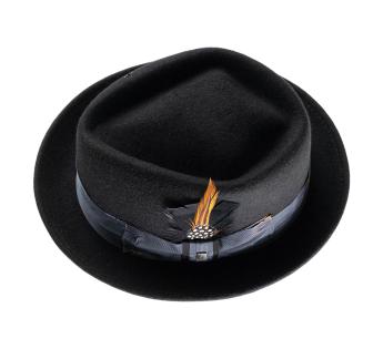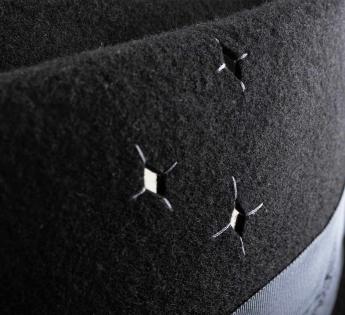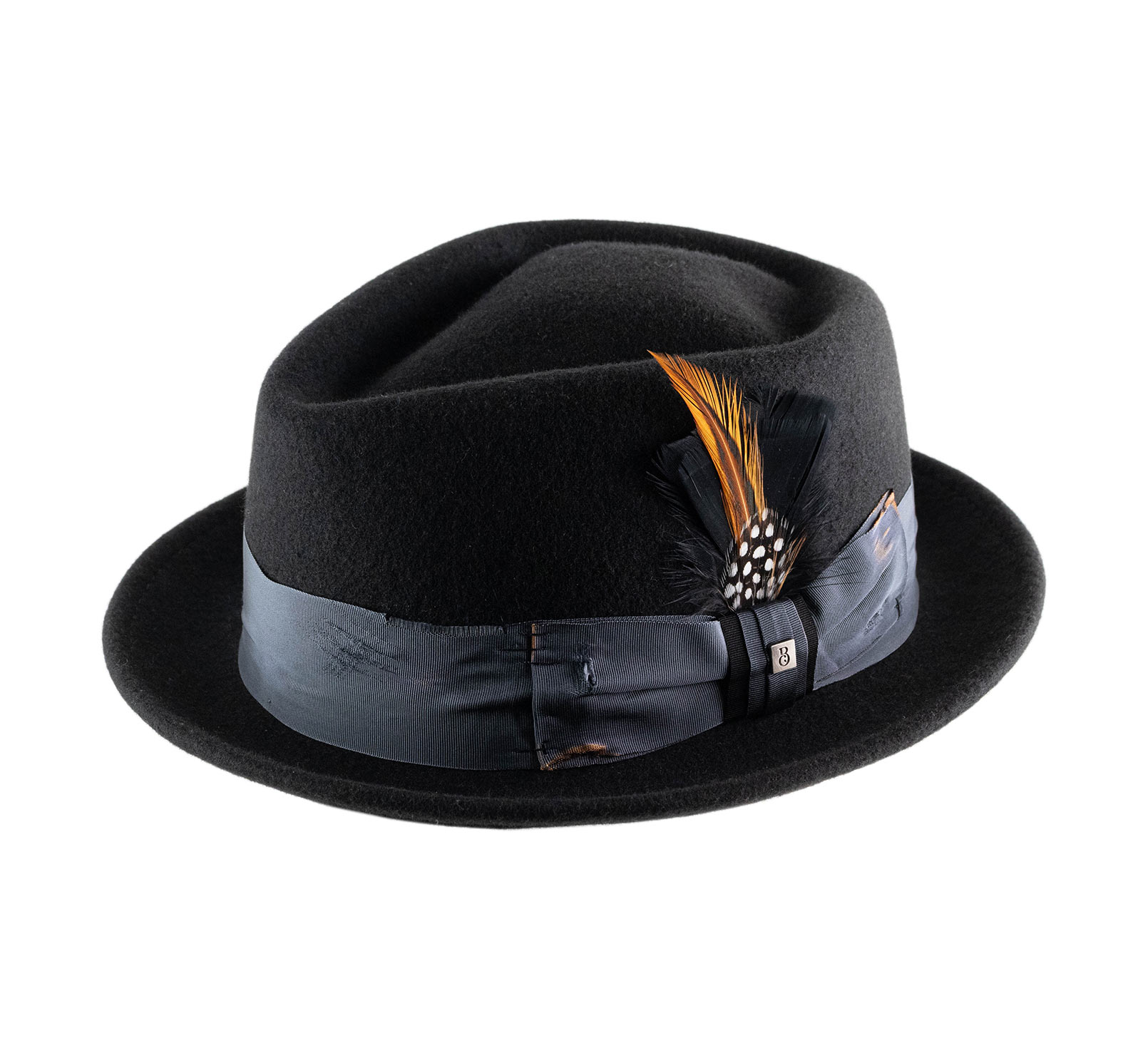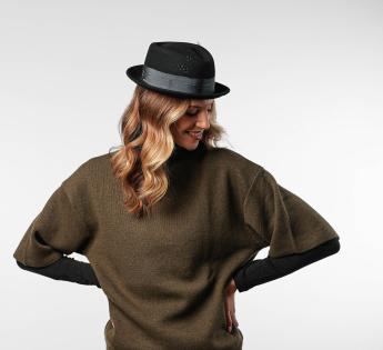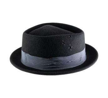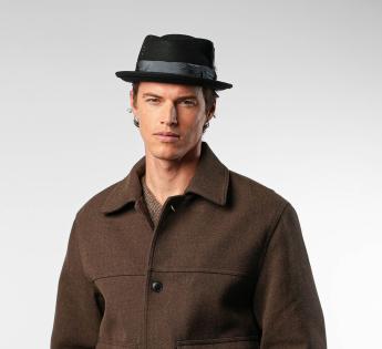 Este porkpie reinterpreta los códigos del clásico con un toque de audacia. Confeccionado en un fieltro de lana de bella densidad, revela un aspecto deliberadamente envejecido, casi cinematográfico.