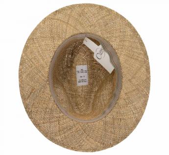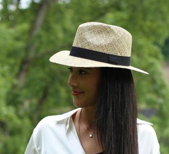 Sombrero de paja de una fabricación ligera gracias a un trenzado ligeramente calado. Las alas bajadas por detrás y por delante refuerzan su lado aventurero mientras protegiendo mejor la frente y la nuca del sol. El diseño es terminado por la adición de una decoración en forma de cinta grano grueso negra con un nudo plano clásico.
