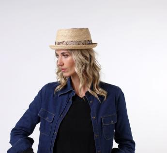 Porkpie natural 100% hecho de materiales duraderos. En efecto, todos los hilos de coser y todos los otros componentes vienen, por ejemplo, de plásticos reciclados o del algodón orgánico. La flexible paja rafia es además obtenida a partir de palmeras tropicales. El modelo es finalmente sutilmente decorado con una cinta de adorno de lino orgánico.