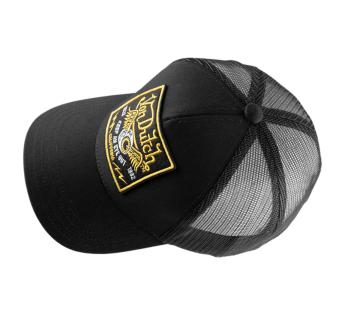 Su parche bordado, el contraste negro y dorado y la silueta trucker despiertan un imaginario americano más crudo, más seguro, casi rockero en la presencia.