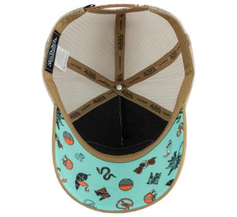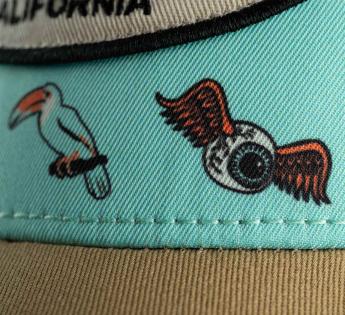 Esta gorra evoca al instante los días soleados, la playa, las actividades al aire libre y esa luz dorada del atardecer. Sus estampados componen un auténtico cóctel de ambientes californianos e insuflan a tu silueta un aire libre, luminoso y decididamente veraniego.