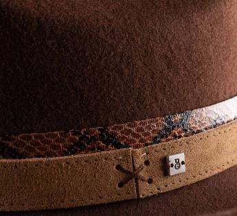 Los adornos con efecto serpiente, realzados con una Etiqueta metálica, marcan un estilo audaz, en la frontera entre lo rústico y lo refinado. Este modelo se inspira en las leyendas del Oeste manteniendo una elegancia muy francesa. Un sombrero de carácter, listo para trazar su camino entre la tradición artesanal y el espíritu aventurero.